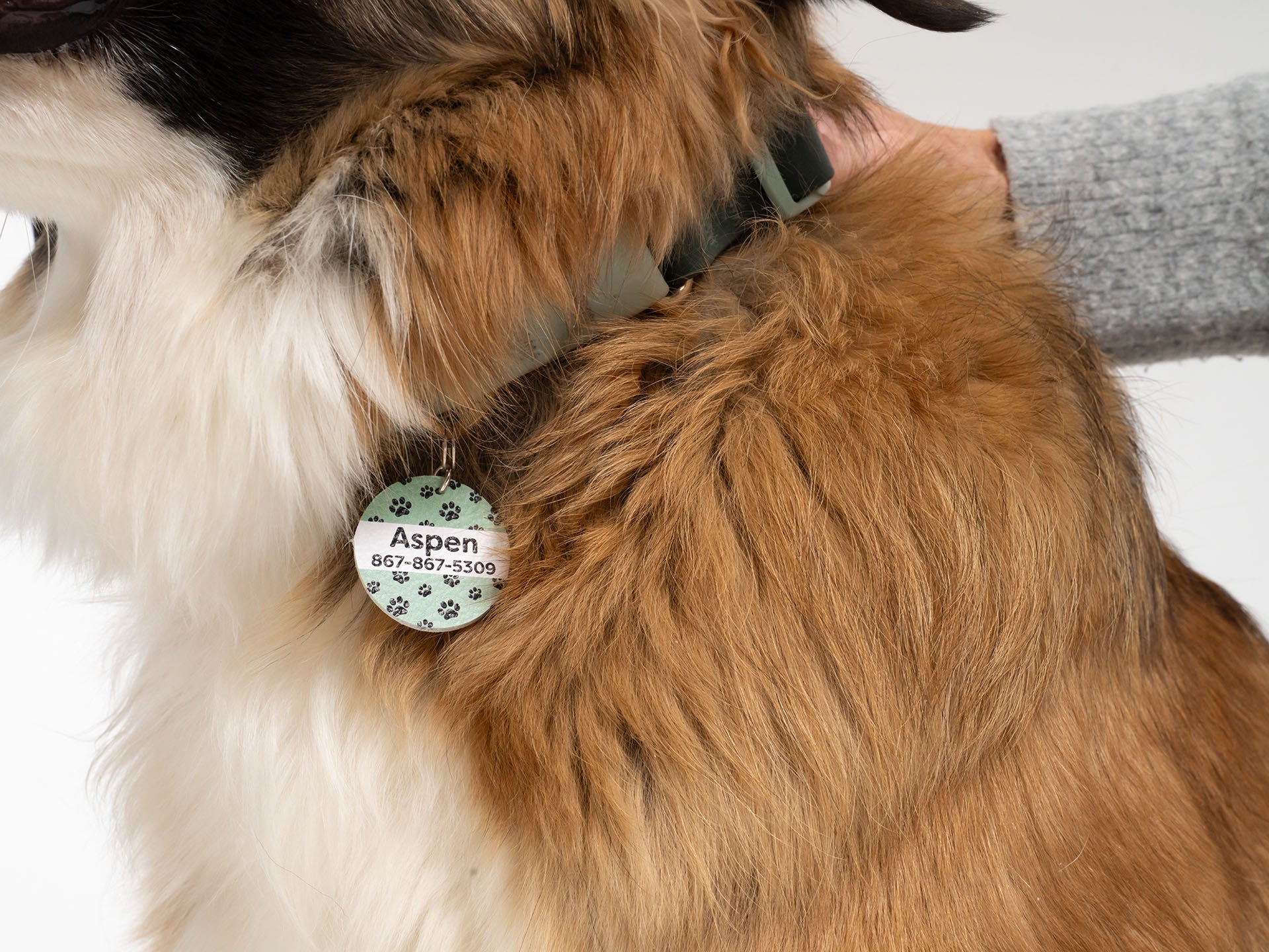 "Aspen is a happy girl in her custom name tag. We love it too!"
